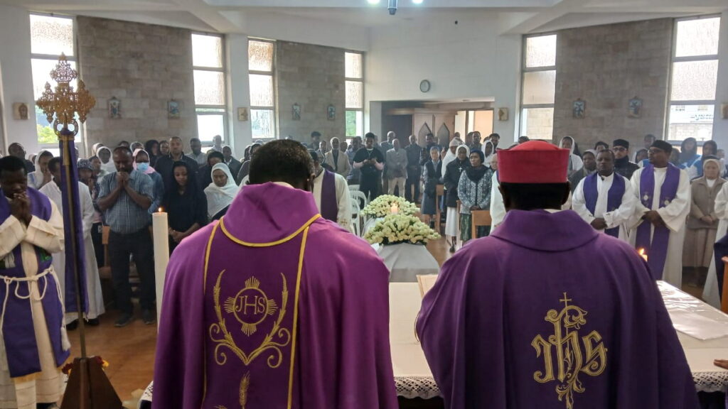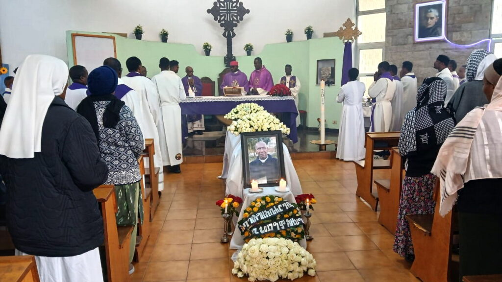 The following day, Mass was celebrated in the Consolata church of the regional house. The bishop of the Vicariate of Hosanna, Mons. Seyum Francois, presided over the Holy Mass. Unfortunately, Cardinal Berhaneyesus and several bishops who knew the father and wished to attend the funeral could not be present, as they were far away at the Jesuit center in Debre Zeit for their annual eight-day retreat. Friends, parishioners, religious, and priests crowded the church. At the end of the Mass in the Latin rite, the funeral liturgy in the Ge’ez rite was celebrated, which does not include the Eucharist, but consists of litanies and prayers for the soul of the deceased.