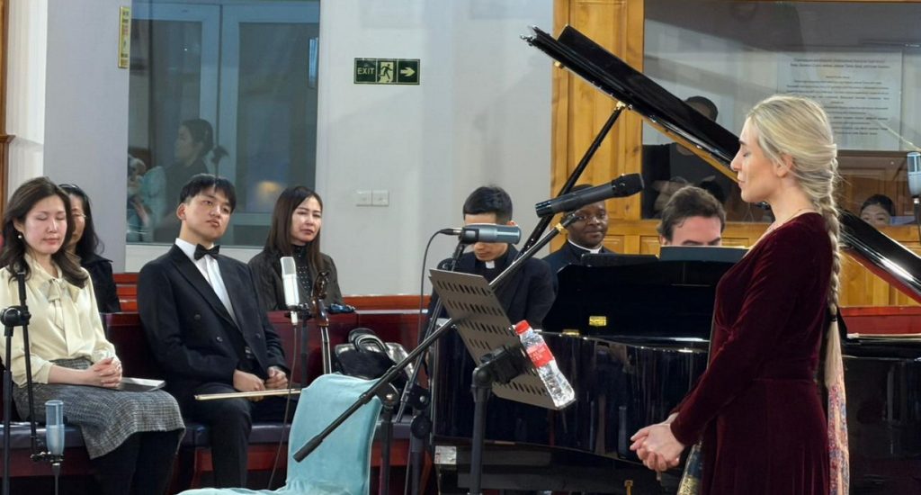 Among the performers we had Valentina Volpe Andreazza, mezzo-soprano expert Singer from Italy, Stefano Salvatori, pianist, composer and conductor from Italy and, the participation of Onon Enkhbat, who accompanied the introductory reading of the Franciscan concert by playing the traditional Mongolian instrument Morin Khuur (The morin huur (or horsehead fiddle) is a musical instrument created by Mongolian herders from the two tail hairs of horses. Mongolians believe that this instrument, imitating the form, shape, and sound of the horse, animates the sounds of the universe).