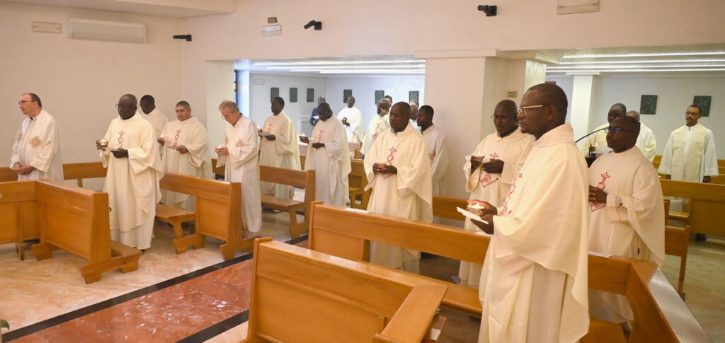 The course closing Mass, on September 27, was presided over by the Superior General, Father James Lengarin. The celebration began in the underground parking lot of the General House, symbolizing the dark world. Each participant was invited to light up a candle from the Paschal Candle, symbolizing that the missionaries celebrating 25 years of priesthood or religious life have passed from the world of darkness to the world of light, which is Christ Himself.